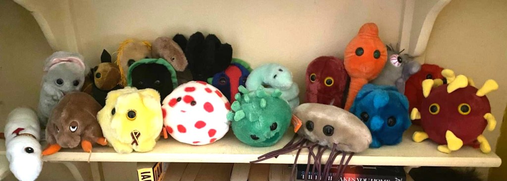 So…vintage earrings and brooches; books on forensics, fungi, botany, insects, microbes, true crime; cat trinkets; embroidered clothing; weird plush; beautiful old glass; jugs and conserve pots; CDs (for the car); scarves; dresses and tops with cats, dinosaurs, weird dark stuff or beautiful florals. I also collect Giant Microbes, have an unhealthy (unless you’re a writer, right?) number of notebooks, and am a sucker for anything with a William Morris print.